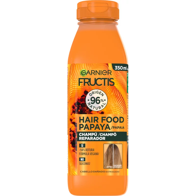Descubre Hair Food Champú Papaya Reparadora, el primer Champú de Fructis con fórmula vegana (sin ingredientes de origen animal o derivados) y 98% de origen natural. Su espuma ligera limpia y repara suavemente tu pelo hambriento sin apelmazar.