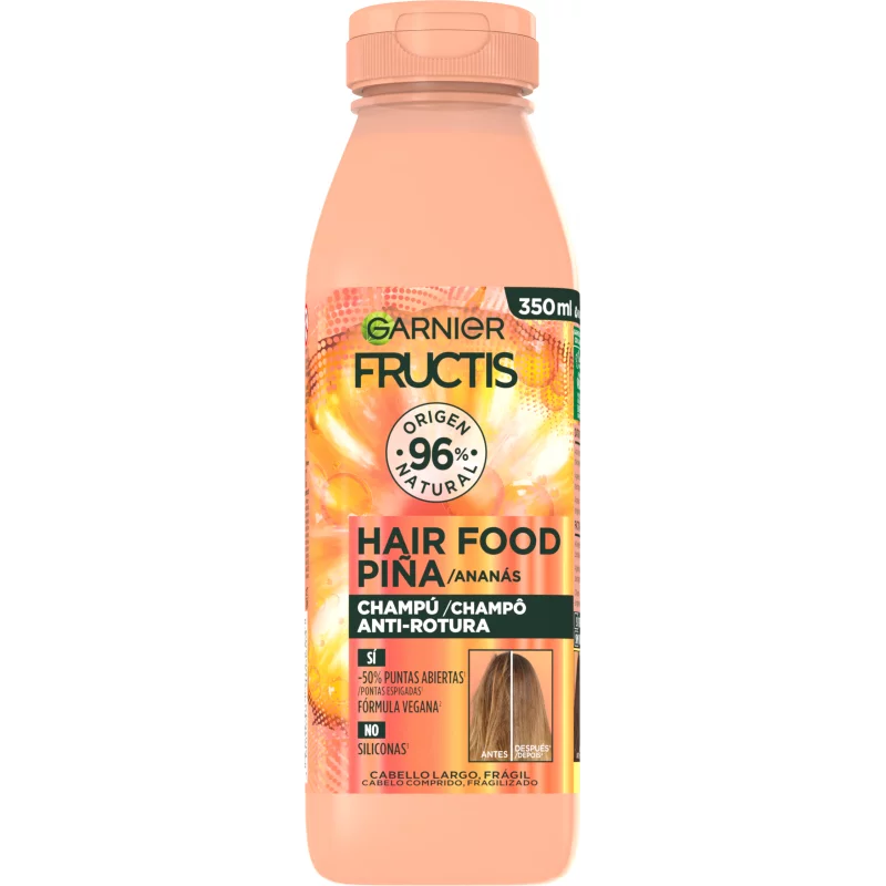 Sumérgete en la frescura tropical con el Champú Hidratante Fructis Hair Food Piña de Garnier, diseñado para cabello largo y frágil. Este champú sin siliconas no solo limpia eficazmente, sino que también reduce las puntas abiertas, proporcionando una solución completa para el cuidado de tu melena. Con una fórmula vegana que fortalece la fibra capilar y aporta suavidad. Experimenta la sensorialidad del aroma a piña en cada lavado, transformando tu rutina en un momento de puro disfrute. Descubre el pode de la piña con la calidad y compromiso de Garnier en esta joya tropical, tu aliado esencial para una melena radiante y resistente.