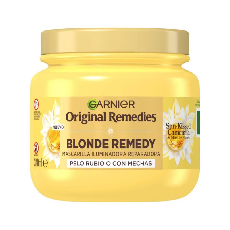 Garnier Original Remedies Sun-Kissed Camomila Blonde Remedy, una mascarilla reparadora iluminadora, que repara los daños de 1 aclarado*, para un pelo 3x más suave** y 72 horas de brillo**.