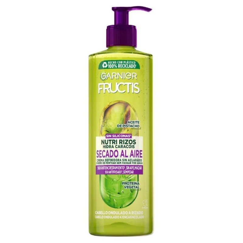 La Crema Sin Aclarado Garnier Fructis Nutri Rizos Secado al Aire es una Crema de Peinado enriquecida con aceite de pistacho y pectina de fruta, una molécula que aporta cuerpo a los rizos, para nutrir y mantener los rizos definidos y con movimiento incluso sin secador.