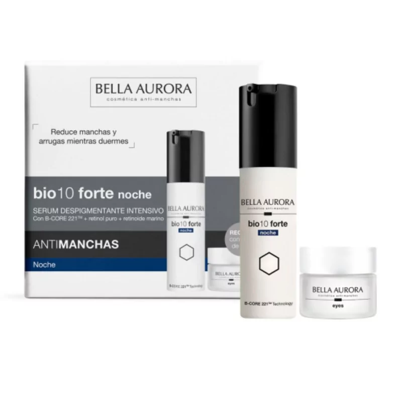 Pack Bio10 forte noche y contorno de ojos el tratamiento despigmentante intensivo de noche formulado para actuar justo donde se originan las manchas: en las células productoras de melanina. Gracias a la exclusiva tecnología BCORE 221™, libera el activo encapsulado directamente en el núcleo de la mancha, logrando una eficacia despigmentante máxima durante las horas de descanso.