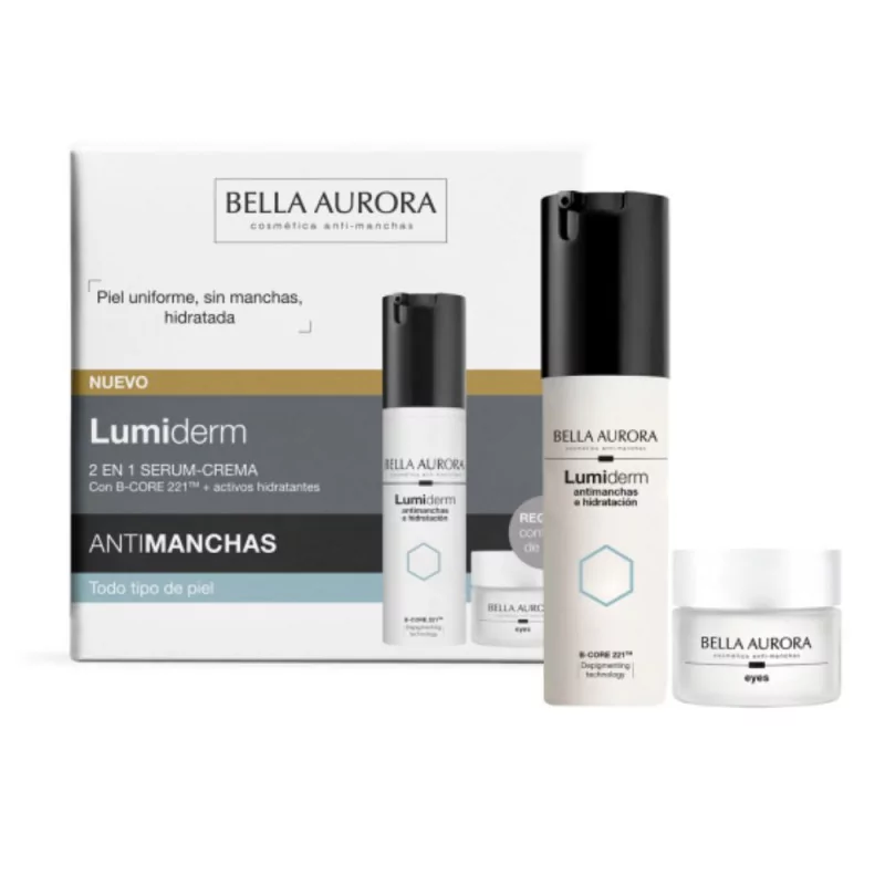 Lumiderm Antimanchas e Hidratación es el innovador sérum-crema 2 en 1 que reduce manchas oscuras y aporta hidratación intensa y duradera en un solo gesto. Su fórmula con la exclusiva tecnología B-CORE 221™ actúa en todas las fases de la mancha para una acción despigmentante profunda y duradera. Además, la betaína actúa como factor natural de hidratación, reteniendo el agua y reforzando la barrera cutánea, mientras que la combinación de los extractos de Fu-ling y carrizo calma la piel y mejora su tolerancia.