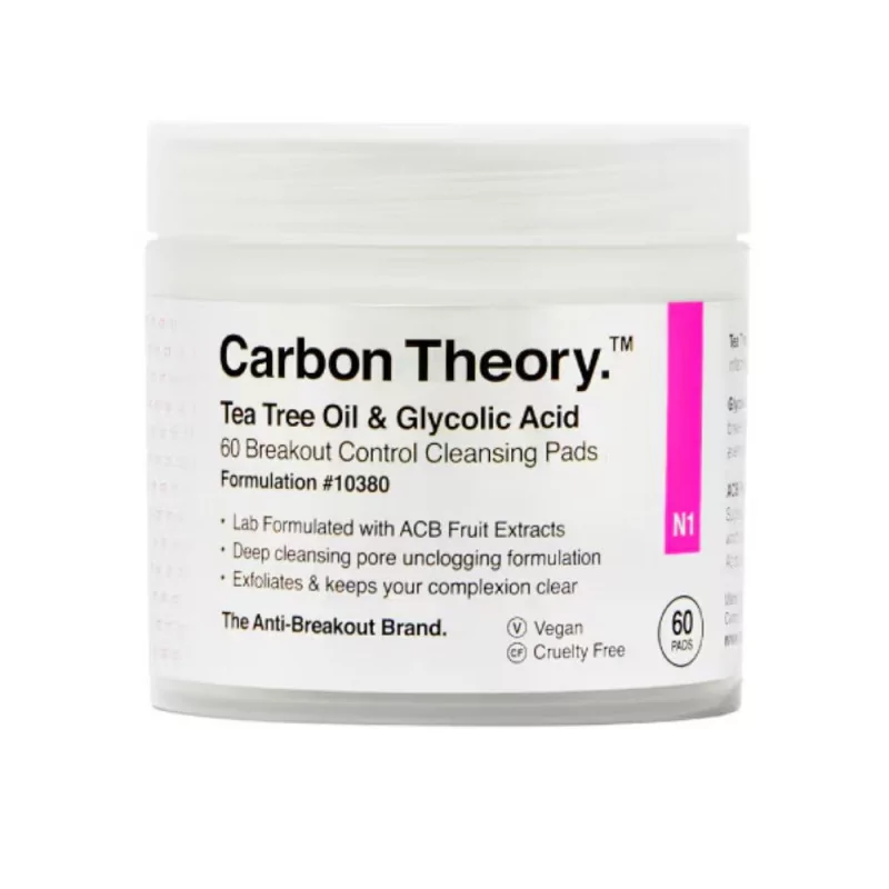 Los Carbon Theory Tea Tree Oil & Glycolic Acid Cleansing Pads son discos limpiadores faciales formulados para controlar los brotes y mantener la piel libre de impurezas. Gracias a la acción combinada del aceite de árbol de té, con propiedades purificantes y antibacterianas, y el ácido glicólico, un exfoliante químico suave, ayudan a desobstruir los poros, mejorar la textura de la piel y prevenir imperfecciones.