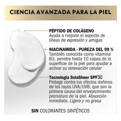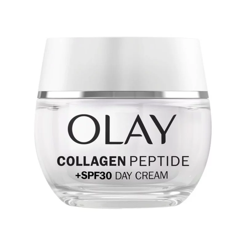 Los péptidos de colágeno, a diferencia de las moléculas de colágeno, pueden penetrar hasta 10 capas debajo de la superficie de la piel y están presentes en Olay Collagen Peptide24 Day Cream.