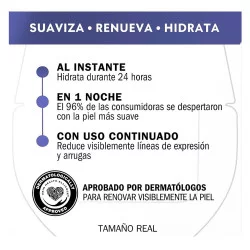 Hidrata 24 h, mejorando visiblemente arrugas y líneas, textura, luminosidad, firmeza, manchas y poros