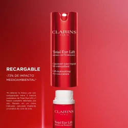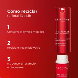 Total Eye Lift es el tratamiento experto que transforma visiblemente la mirada en solo 30 segundos*, gracias a una doble innovación en ciencia y fórmula. Incorpora la [RETINOL-LIKE TECHNOLOGY], con un potente extracto de harungana bio tan eficaz como el retinol** y suave para el contorno de los ojos. Este activo, con eficacia patentada***, potencia la producción de colágeno x12****. Se combina con un nuevo extracto de Jania roja procedente de la biotecnología para un efecto lifting de larga duración. Su textura bálsamo forma una red tensora sobre la piel (PRO-TIGHTENING MATRIX) para un efecto lifting inmediato, cuya eficacia ha sido probada mediante un nuevo protocolo de test real Clarins. Esta recarga debe utilizarse exclusivamente con el frasco original de Total Eye Lift*****. *Autoevaluación, percibida por 111 mujeres. **Estudio clínico comparativo realizado sobre la eficacia antiarrugas y alisadora con 46 mujeres que aplicaban una base con o bien extracto de harungana bio o bien retinol con un % de ingredientes idéntico al del producto acabado - 56 días. ***Dos patentes emitidas en Francia pertenecientes a Clarins sobre la eficacia del extracto de harungana. ****Test in vitro realizado con el extracto de harungana. *****La recarga no se puede utilizar sola.