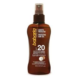Aceite protector solar SPF20 con Aceite de Coco y Aloe y Filtros solares. Protección UVA (causantes del envejecimiento prematuro de la piel), UVB e Infrarrojos. El Aceite de Coco se utiliza como bronceador y, junto con el Aloe Vera, la piel se mantiene bronceada e hidratada.