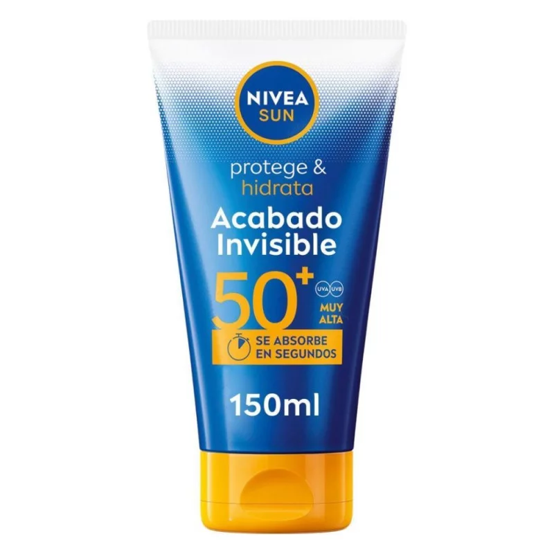 NIVEA SUN Protege & Hidrata Loción Solar Acabado Invisible SPF 50+ ofrece una protección muy alta y eficaz contra los rayos UVA/UVB con una nueva fórmula muy ligera, no pegajosa y de acabado invisible que se absorbe en segundos. Reduce eficazmente el estrés oxidativo de la piel a nivel celular. Su fórmula es resistente al agua y además contiene Ácido Hialurónico, el cuál proporciona una hidratación profunda sin dejar residuos blancos, para una sensación de piel sana y suave. Además, su fórmula es respetuosa con los océanos al no contener microplásticos o los filtros UV Octinoxato, Oxybenzona u Octocrileno.