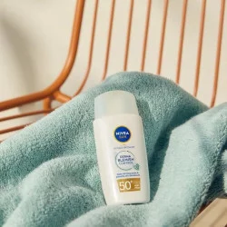Fluido facial ultraligero FP50+ de acabado seco, efecto matificante y de rápida absorción que protege contra el envejecimiento prematuro de la piel, no obstruye poros y reduce y previene imperfecciones. Con niacinamida y protección contra los rayos UVA/UVB.
