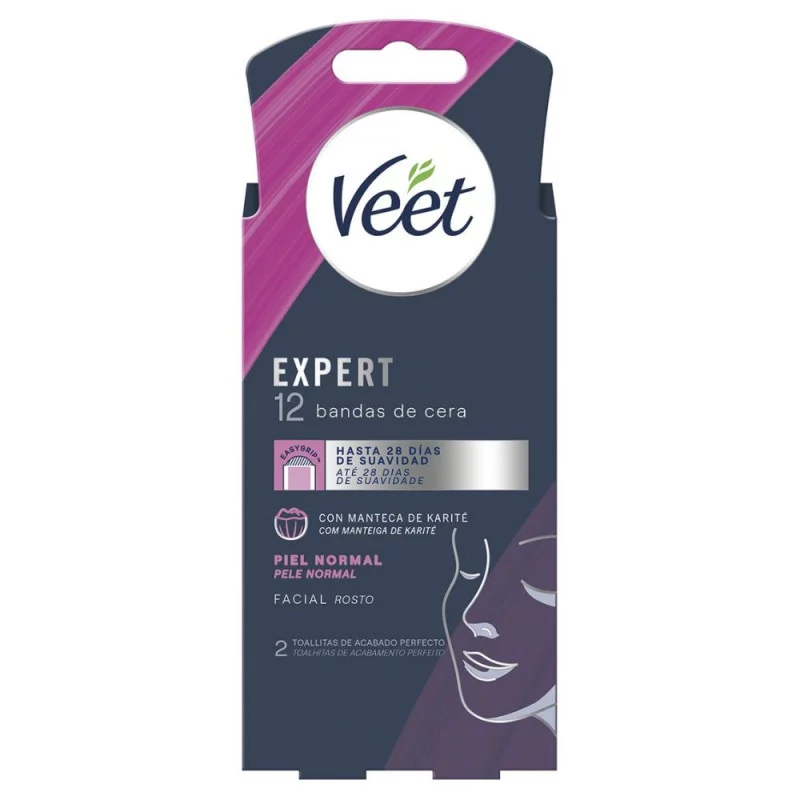 Veet Expert Bandas de Cera Fría para Depilación Facial, Perfectas para el Labio Superior, con Manteca de Karité, 12 Tiras
