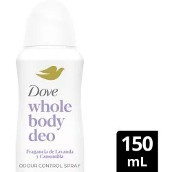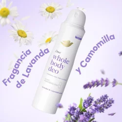 ¿Estás preparada para una experiencia de frescura total? Descubre el spray desodorante Dove Whole Body con aroma a lavanda y camomila. Este desodorante en aerosol refresca tu piel de inmediato y ofrece una protección contra los olores que dura 72 horas, especialmente cuando lo necesitas más.
