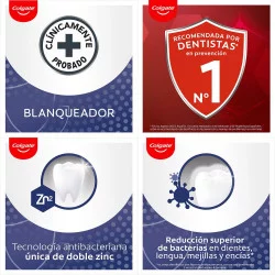 El dentífrico Colgate Total Blanqueador proporciona una protección antibacteriana y mantiene limpia toda tu boca. Esta pasta de dientes antibacteriana elimina la placa, protege contra la caries y revitaliza las encías.