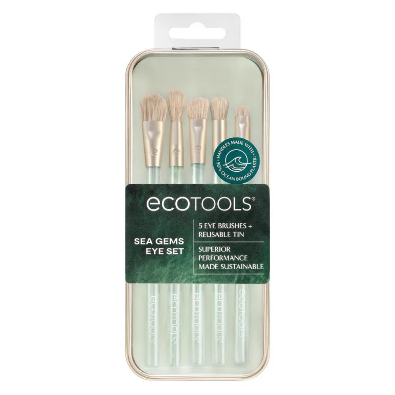 El juego de pinceles para sombras de ojos Sea Gems de EcoTools incluye 5 pinceles densos para maquillaje de ojos y una lata reutilizable para crear el look de ojos perfecto y guardar los pinceles. El juego de pinceles para sombras de ojos incluye el pincel para ojos integral, el pincel cónico para ojos, el pincel para difuminar ojos, el pincel para difuminar, el pincel para sombras en ángulo y una lata reutilizable.