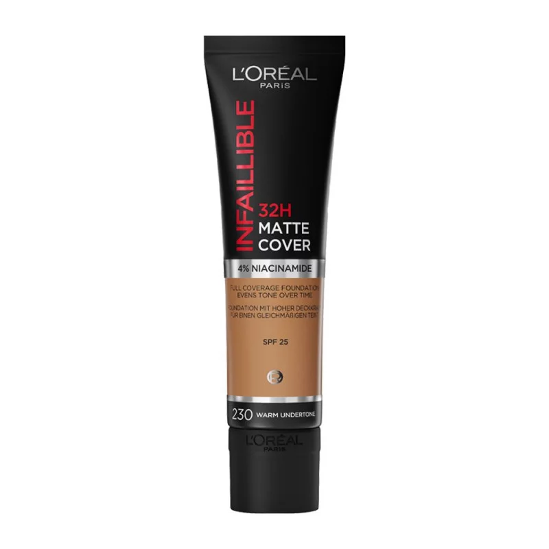 Nuestra nueva fórmula Infalible Matte Cover con una textura ultra fluida se adapta a tu piel para un acabado mate 32h. Máxima cobertura mate durante todo el día para una piel sin brillos 32h Resiste al agua, resistente al sudor, resistente al calor. Alisa visiblemente la piel gracias a su contenido en Niacinamida.