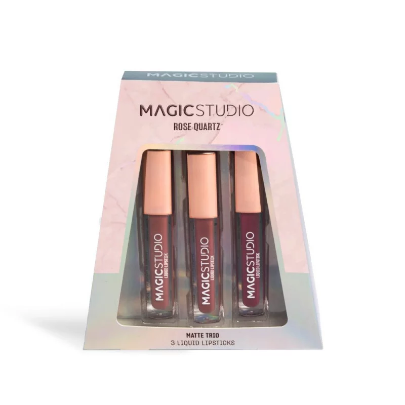 Set de Pintalabios 'Rose Quartz' de IDC MAGIC STUDIO. Este set contiene tres labiales líquidos en colores rojo coral, rosa pastel y marrón nude, cada uno con una fórmula de alta pigmentación y larga duración para lucir tus looks perfectos.