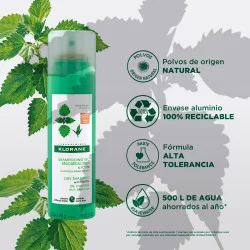 Aliado eficaz contra los cabellos grasos, el champú seco a la ortiga de Klorane absorbe el exceso de sebo en 2 minutos, para purificar y refrescar el cabello sin mojarlo. El tono beis totalmente natural se adapta al cabello oscuro para dejar un acabado invisible. La acción seborreguladora de la ortiga y los polvos absorbentes controlan la producción de sebo durante 48 horas*, para poder espaciar más los lavados del cabello**. Después de su aplicación, el cabello castaño queda limpio y con volumen. El formato en spray sin aclarado ofrece una aplicación fácil para refrescar el cabello en cualquier momento mientras se ahorra agua.