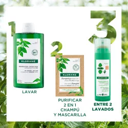 • Absorbe: la ortiga seborreductora y los polvos minerales naturales absorben el exceso de sebo, y evitan la aparición de grasa entre los lavados.