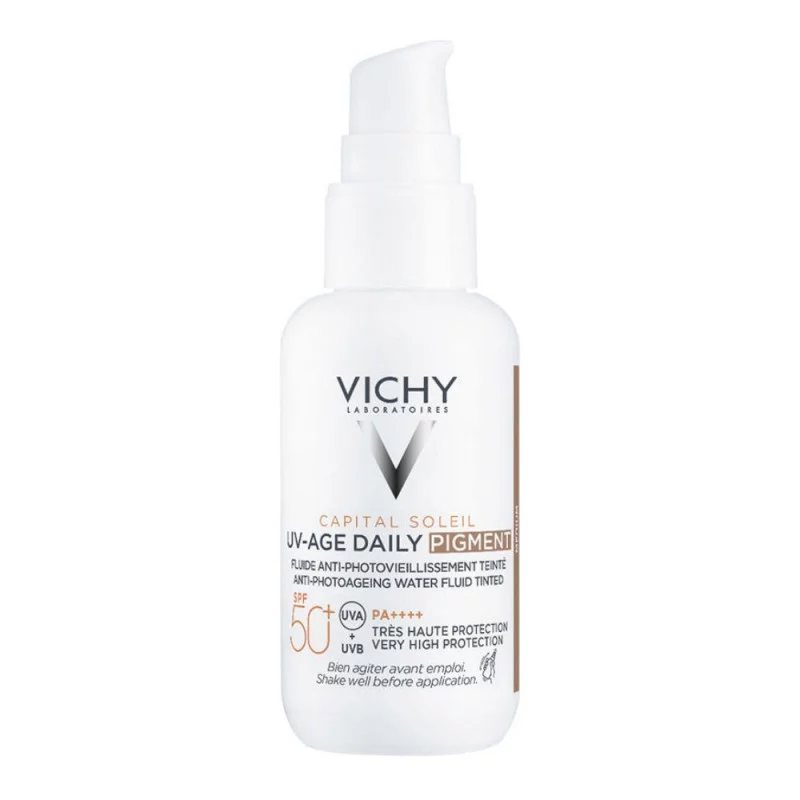 UV-AGE DAILY es un fluido antifotoenvejecimiento de Vichy, con una acción doble protectora y correctora. Su tecnología Netlock multipatentada forma una película protectora contra los rayos UV ultrafina y ultrarresistente para una alta protección contra los rayos UVA y UVB, responsables de más del 80 % de los signos de envejecimiento. Además, es un solar para deportistas, resistente al sudor y apto para un uso diario activo. Ahora disponible en una versión con color, enriquecida con pigmentos minerales, proporciona una cobertura ligera para mejorar el tono de la piel.
