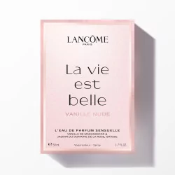 Descubre La vie est belle Vanille Nude, la nueva fragancia femenina de Lancôme que celebra tu autenticidad con una caricia olfativa profundamente sensual. Esta Eau de Parfum floral musky gourmand fusiona el resplandor del jazmín solar con la dulzura de una vainilla Bourbon glaseada, para culminar en una sobredosis de almizcles blancos cremosos y sándalo que se funden con tu piel. Más que un perfume, es una declaración íntima de libertad y placer. Inspirada en la pastelería francesa, esta fragancia prolonga la felicidad con cada nota y revela tu esencia más genuina. Su duración y elegancia te acompañan todo el día, envuelta en un frasco joya que es puro deseo.