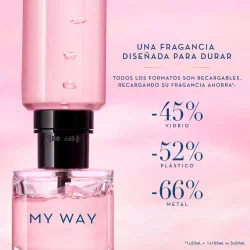 El recambio de My Way Eau de Parfum presenta un diseño innovador, que permite recargar el frasco vaporizador sin perder ni una sola gota de la fragancia. Cada formato de MY WAY (30, 50 o 90 ml) está diseñado para que se pueda desenroscar y recargar en casa con el mismo frasco de recambio. El recambio de MY WAY es un frasco de 150 ml que se vende en un estuche.