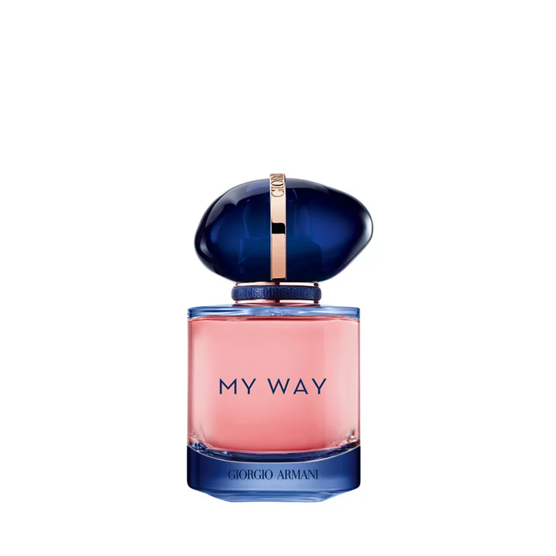 El frasco: El tapón azul y dorado en forma de joya, simboliza un talismán que encierra todas las experiencias. La intensidad de estos momentos plasmados en el tapón ha impregnado el frasco de My Way Intense, ya que su cristal está ahora bañado en reflejos azules translúcidos.