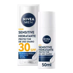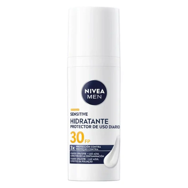 NIVEA MEN Sensitive Hidratante Protector SPF30 proporciona un cuidado avanzado para la piel sensible con una fórmula de triple protección. Enriquecida con el Complejo VitaminPRO (Vitamina E y Provitamina B5) y antioxidantes, esta crema hidratante ligera y de rápida absorción protege tu piel de los rayos UVA/UVB, los efectos de la luz azul y la contaminación. Su fórmula no grasa proporciona una hidratación inmediata, dejando la piel hidratada y con un aspecto saludable durante todo el día. Especialmente diseñada para pieles sensibles, está dermatológicamente probada y puede utilizarse también después del afeitado para una mayor protección. Aplicar diariamente sobre el rostro y el cuello limpios para conseguir una piel más fuerte y resistente con un confort duradero.